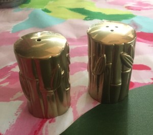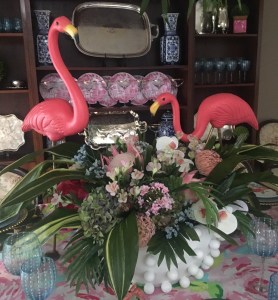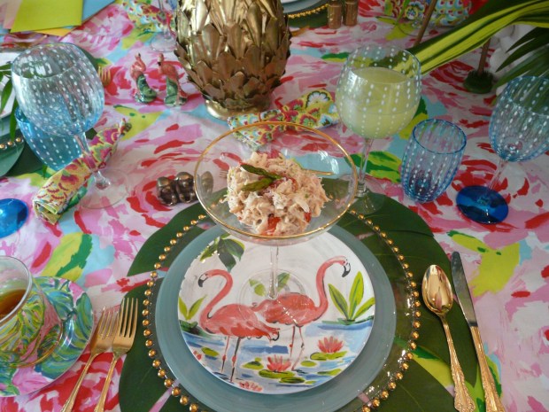 whether it was bamboo salt and pepper shakers, brass monkey figurine, or china flamingos. The menu was designed with hot, tropical summers in mind: Paula Deen’s Crab Martini, Chicken Salad, Grilled Peach Salad and Citrus Melon Balls.